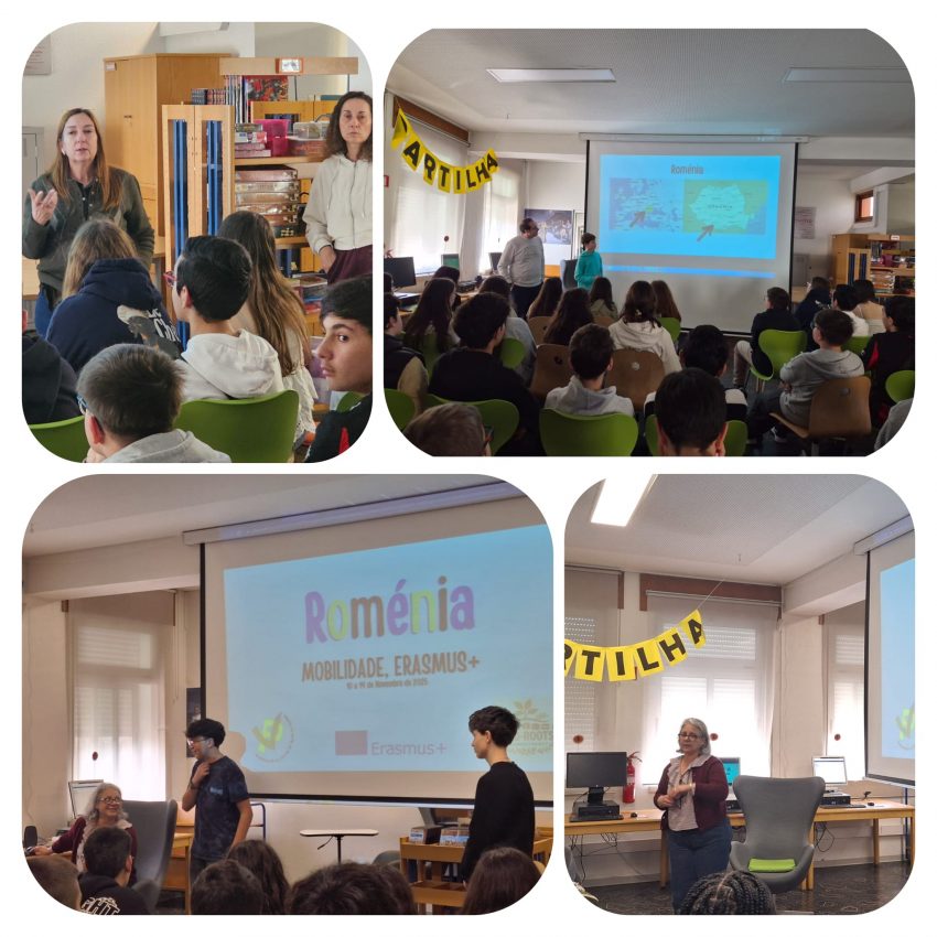 Após a mobilidade à Roménia no primeiro período, no âmbito do Projeto Erasmus “Eco-Roots” em que o nosso agrupamento está envolvido, foi altura de mostrar a várias turmas, as atividades realizadas, as aprendizagens feitas e aspetos culturais que nos aproximam e outros que nos diferenciam. O Duarte do 7.°G, o João do 9.°C e o…