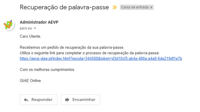 Em seguida, consulte o seu email, e clique na hiperligação para recuperar a palavra passe. Nota: o endereço administrador@aevp.net é automatizado e não serve para contatar direção, serviços administrativos ou outros do nosso Agrupamento.