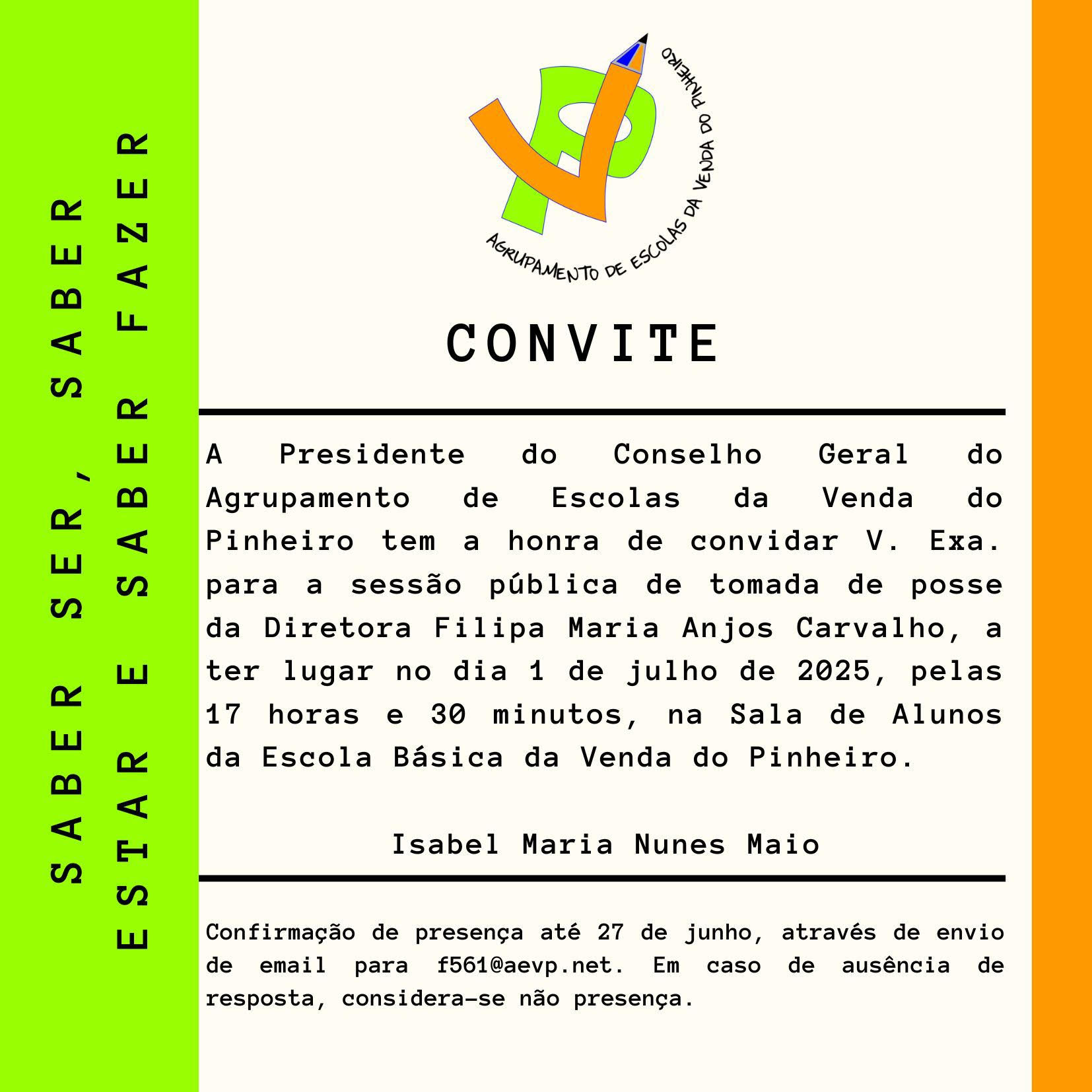 Convida-se a comunidade escolar a estar presente na sessão de tomada de posse da Diretora Filipa Mª Anjos Carvalho, dia 1 de julho, pelas 17:30, na Escola Básica da Venda do Pinheiro.